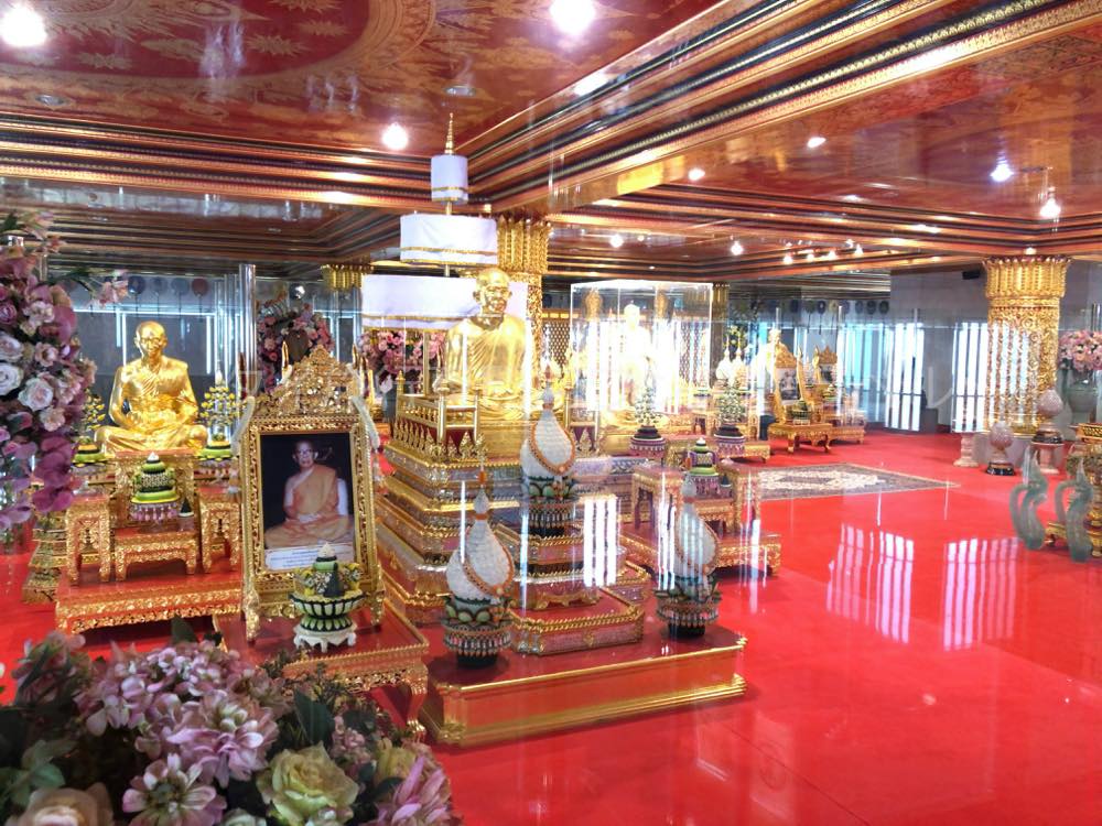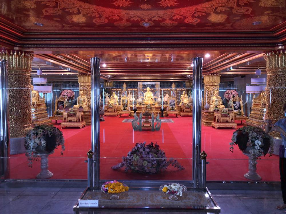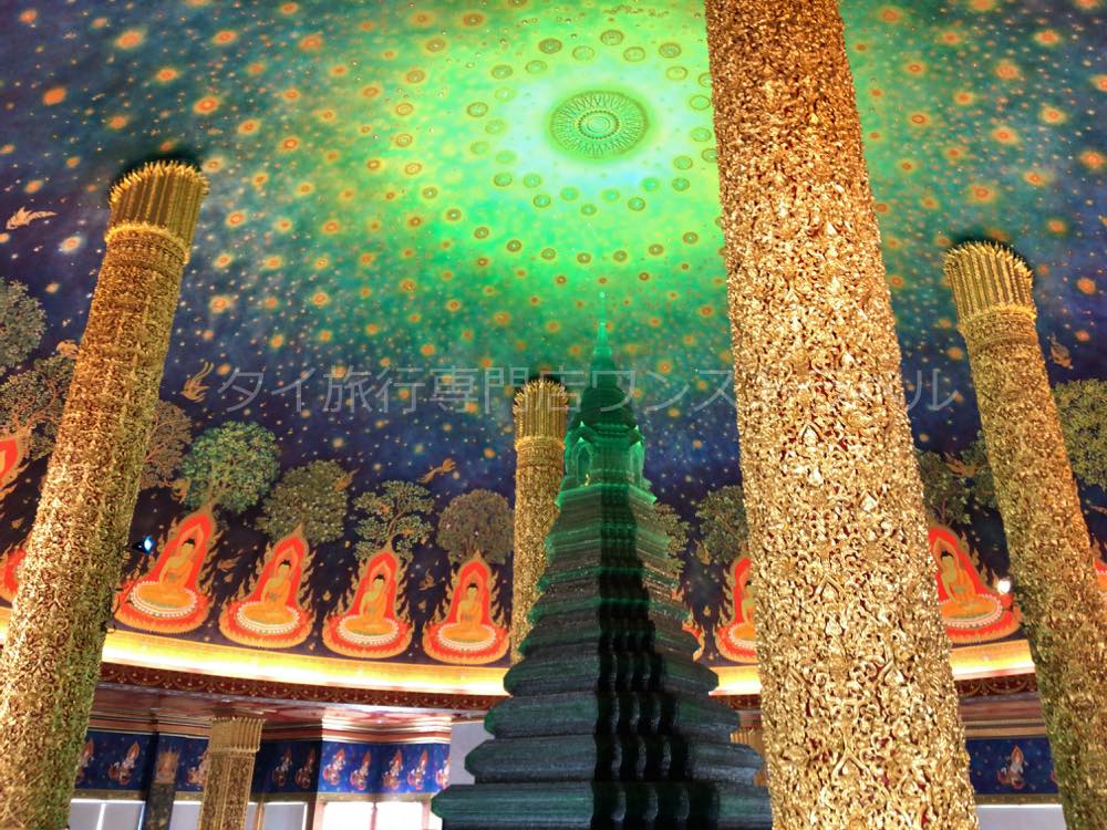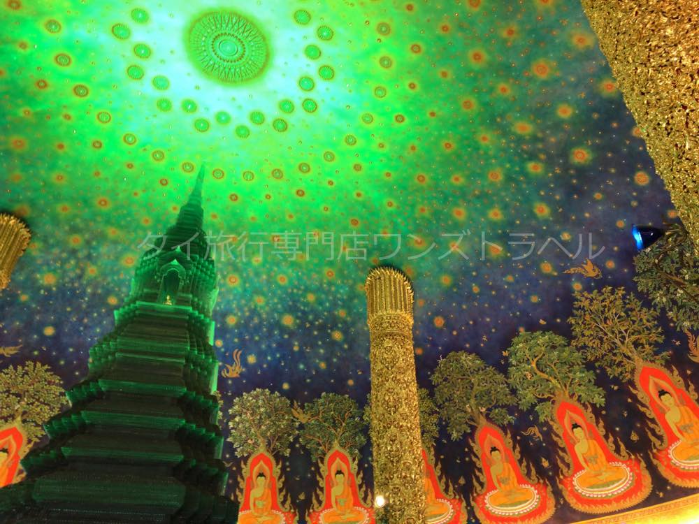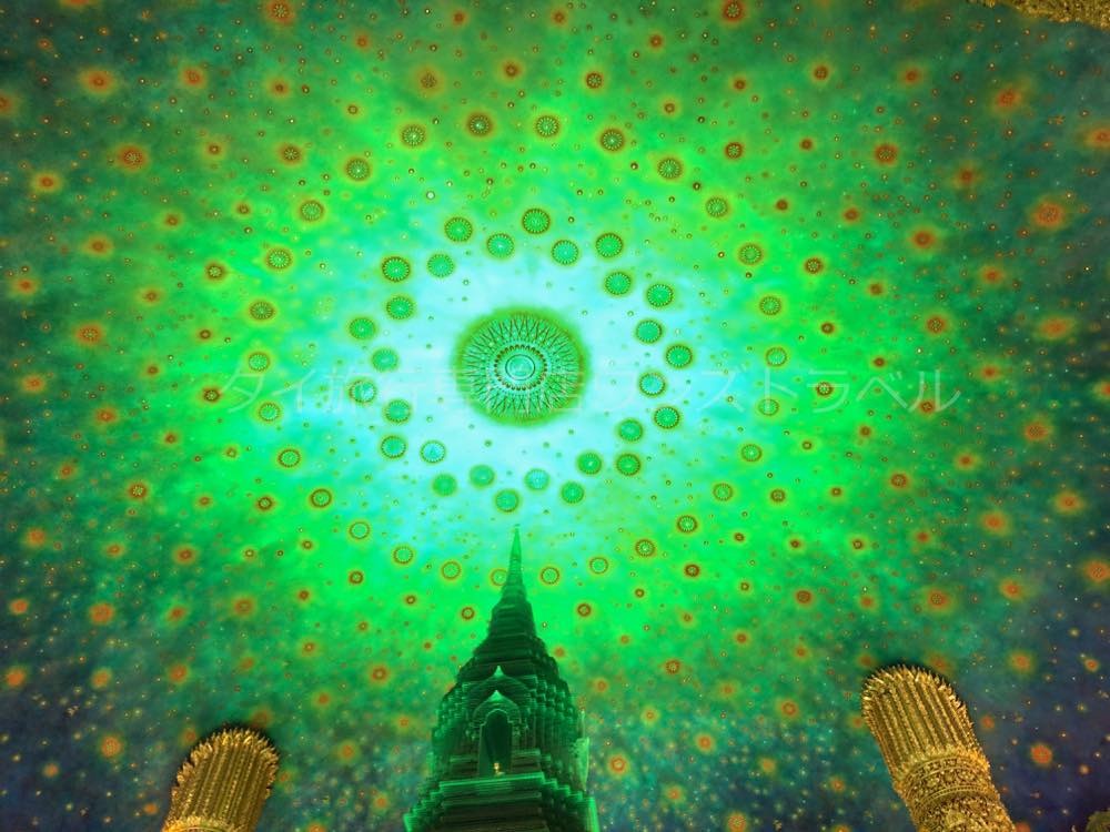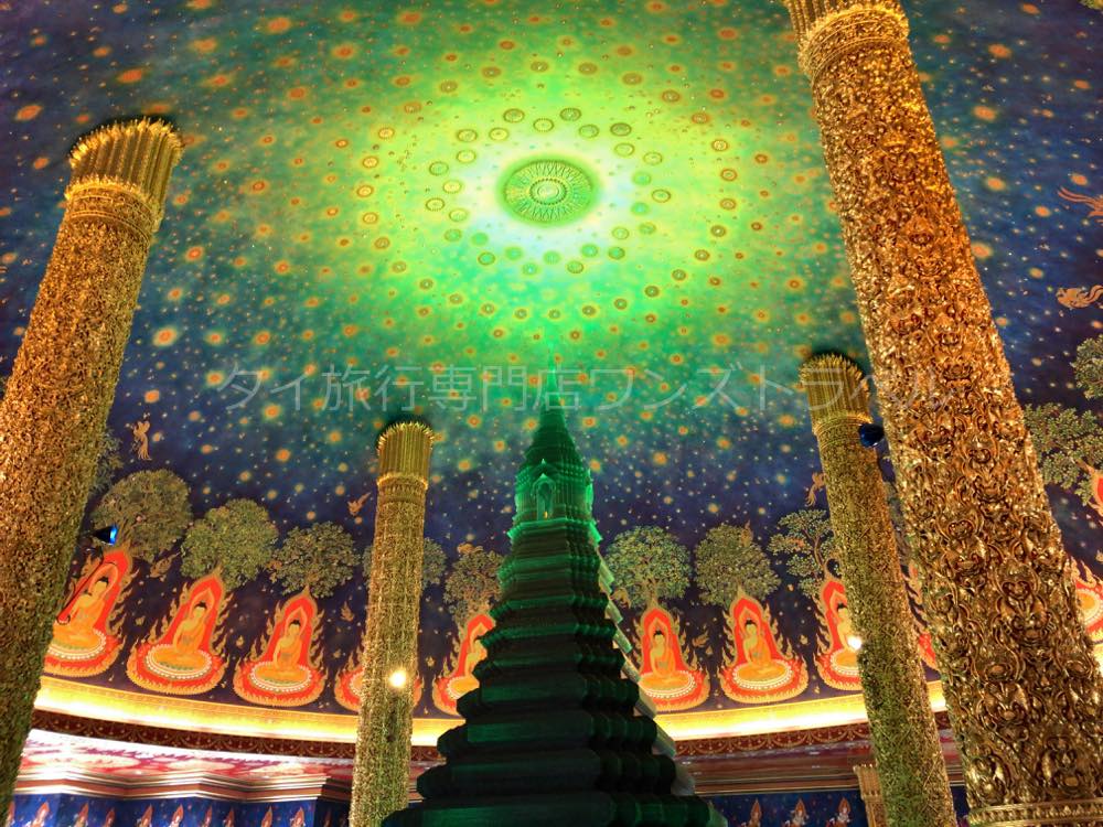 天井に描かれた曼荼羅のような美しい絵と、透明感あふれるガラス仏塔が織りなす空間は、まるで異世界に迷い込んだかのような神秘的な雰囲気を味わえます。